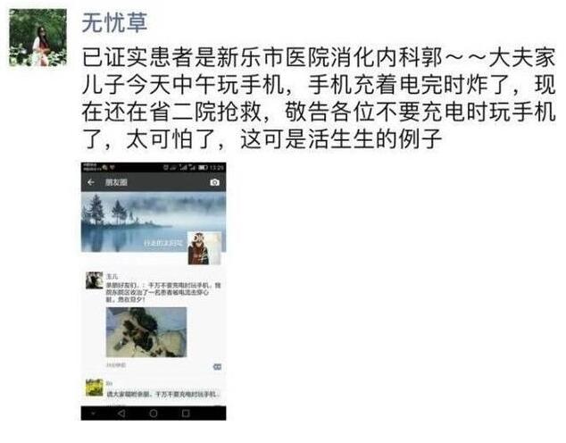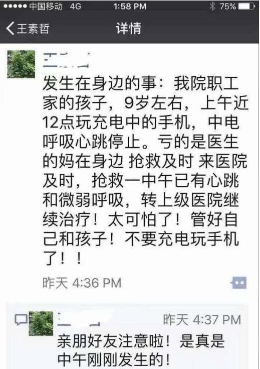 最近,不少莊里人的朋友圈都在轉(zhuǎn)發(fā)這樣一條信息:提醒大家,千萬不要充電時(shí)玩手機(jī)!河北醫(yī)科大學(xué)第二醫(yī)院兒科東院區(qū)收治一名患者被電流擊穿心臟,危在旦夕!