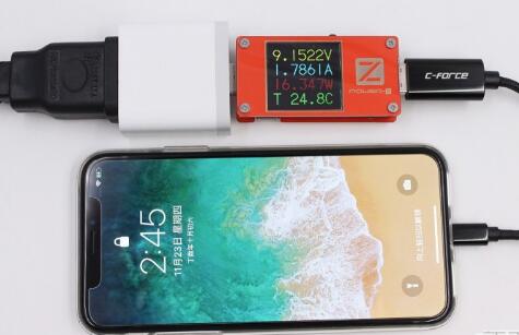 使用小米6 原裝充電器和這條快充線給iPhoneX(剩余電量25%)充電。從ChargerLAB POWER-Z KT001的測(cè)試數(shù)據(jù)線來看,充電電壓在連接數(shù)據(jù)線一段時(shí)間之后從5V上升到了9V,充電峰值功率最高達(dá)到14.5W,與此前蘋果官方USB PD充電器的功率相當(dāng)。