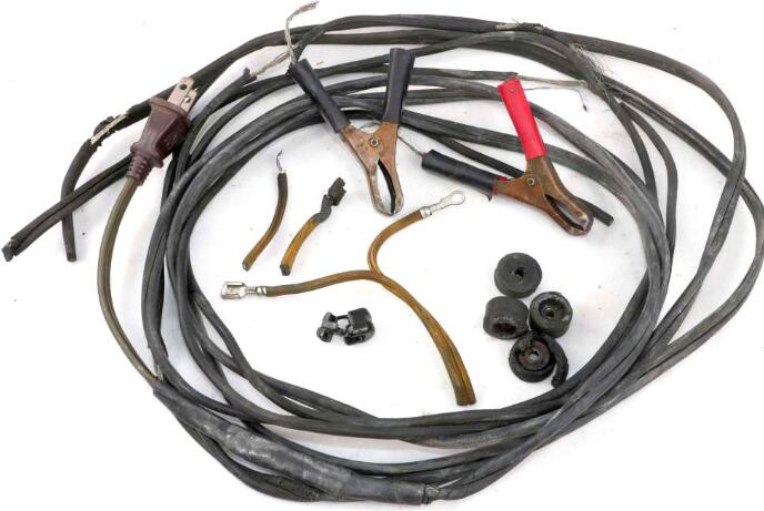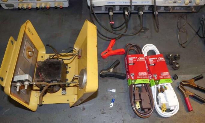 我買(mǎi)了翻新充電器需要的所有材料。我從Home Depot買(mǎi)了兩根6英尺的延長(zhǎng)線(xiàn),這兩根線(xiàn)的顏色必須不同,這樣才能將電池電線(xiàn)和AC線(xiàn)區(qū)分開(kāi);電池夾是我很多年前從亞馬遜上買(mǎi)的——其實(shí)我早就想做這件事了;我的電盒中還有環(huán)形和鏟形端子;我從Digi-Key買(mǎi)了四個(gè)橡膠腳墊和通孔扣。