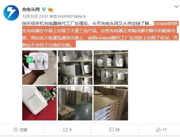 充電頭網(wǎng)在微博的消息稱,coolpad的快充充電器在市面上出現(xiàn)了大量工包產(chǎn)品。
