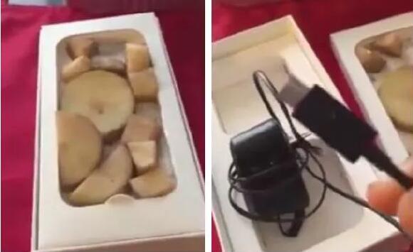 她在確認(rèn)手機(jī)一切正常之后,就買下了這部手機(jī)。但是回家后她打開包裝卻發(fā)現(xiàn),盒子里沒有iPhone 6,只有11塊已經(jīng)變質(zhì)的土豆……