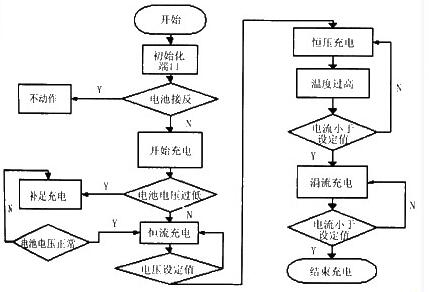上電后,單片機(jī)首先檢查電池是否接反,電池電壓是否因?yàn)殡姸^低,如果電壓過低,先使用小電流給電池充電一間,使電壓達(dá)到三階段充電常水平在開始充電,如果電常則直接進(jìn)入正常充電階首先是恒流充電階段,充電小于0.5 C,一般取0.1 C,電壓會緩慢的上升,當(dāng)電壓到一定階段(本例中采用電60V)改為恒壓充電,此時隨電過程的進(jìn)行電池內(nèi)阻會逐升,充電電流會隨著內(nèi)阻的而減小,當(dāng)單片機(jī)檢測電流減小到一定的值(小于恒流充電值的1/1 0),立即轉(zhuǎn)入涓流充電階段,充電電流一般取0.3C,在此階段電池電壓會減小,當(dāng)充電電流小于0.0 1 C時即可認(rèn)為電池已充滿,單片機(jī)會自動將電池從充電電路中切除。在恒壓階段如果單片機(jī)檢測到電池溫度高于45度則自動轉(zhuǎn)入第三階段,待溫度下降后再轉(zhuǎn)入第二階段。充滿后通過單片機(jī)關(guān)斷繼電器,停止充電.。